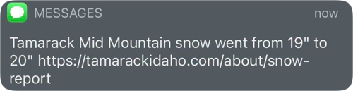 Get text messages when your favorite mountains get new snow! Currently supports Tamarack, Brundage, Bogus Basin and Sun Valley.